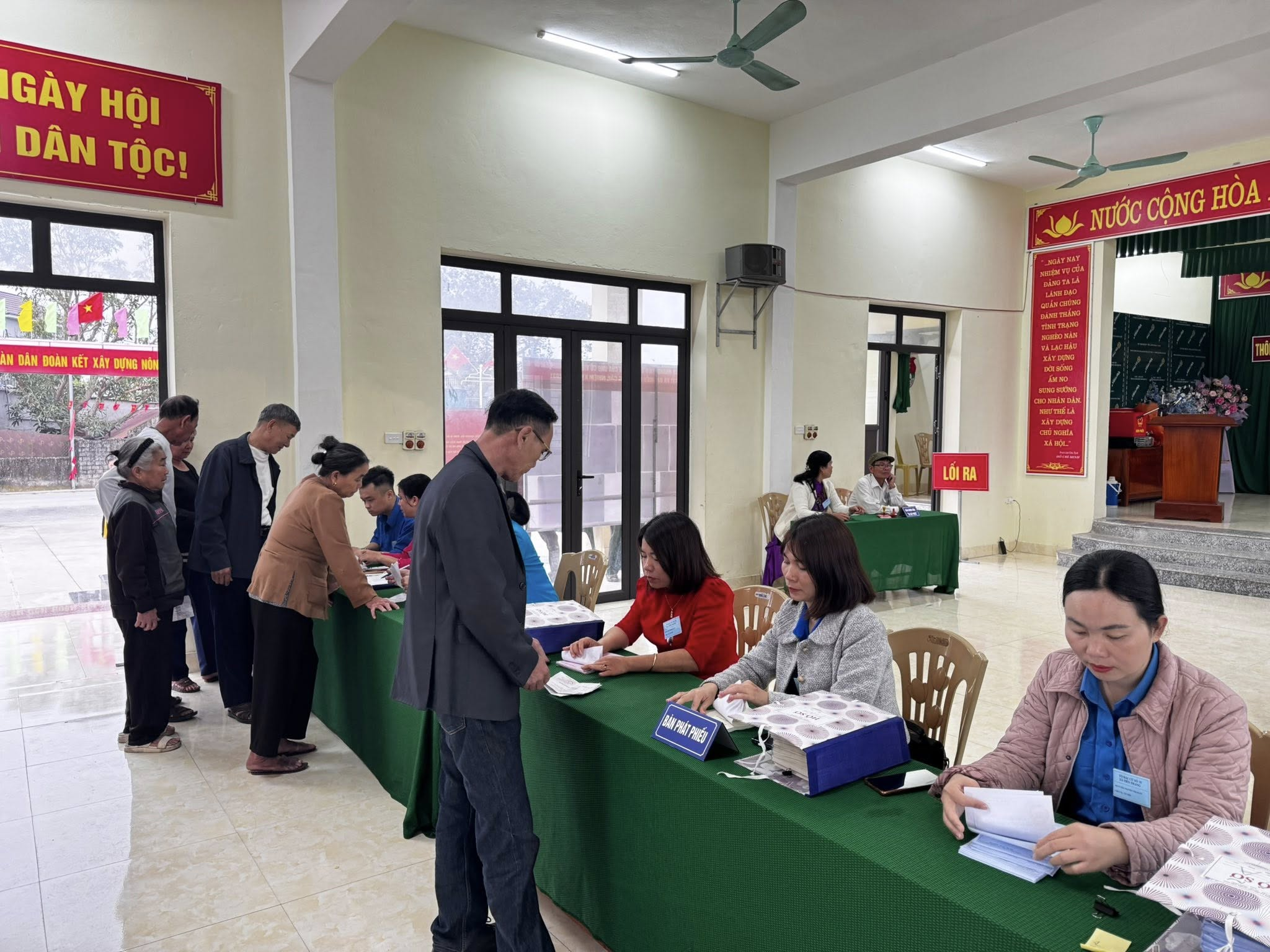Ngay từ sáng sớm, đông đảo cử tri tại các thôn đã nô nức có mặt tại các khu vực bỏ phiếu, thực hiện quyền và nghĩa vụ công dân của mình. Công tác tổ chức được chuẩn bị chu đáo, khu vực bỏ phiếu được trang trí trang trọng với cờ, hoa, băng rôn, khẩu hiệu; các tổ bầu cử thực hiện đầy đủ quy trình theo quy định, đảm bảo an ninh trật tự và tạo điều kiện thuận lợi cho cử tri tham gia bỏ phiếu.