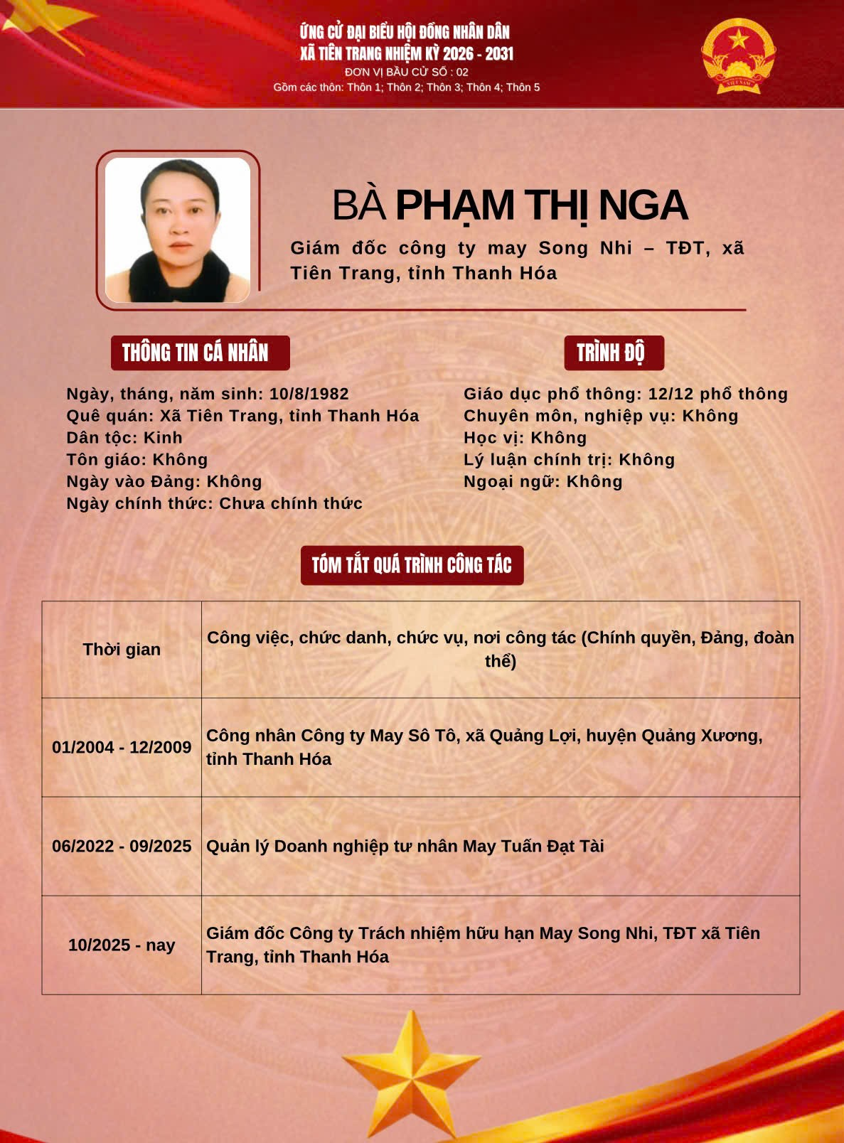 TIỂU SỬ TÓM TẮT CỦA NHỮNG NGƯỜI ỨNG CỬ ĐẠI BIỂU HĐND XÃ TIÊN TRANG KHÓA III, NHIỆM KỲ 2026-2031 - ĐƠN VỊ BẦU CỬ SỐ 01