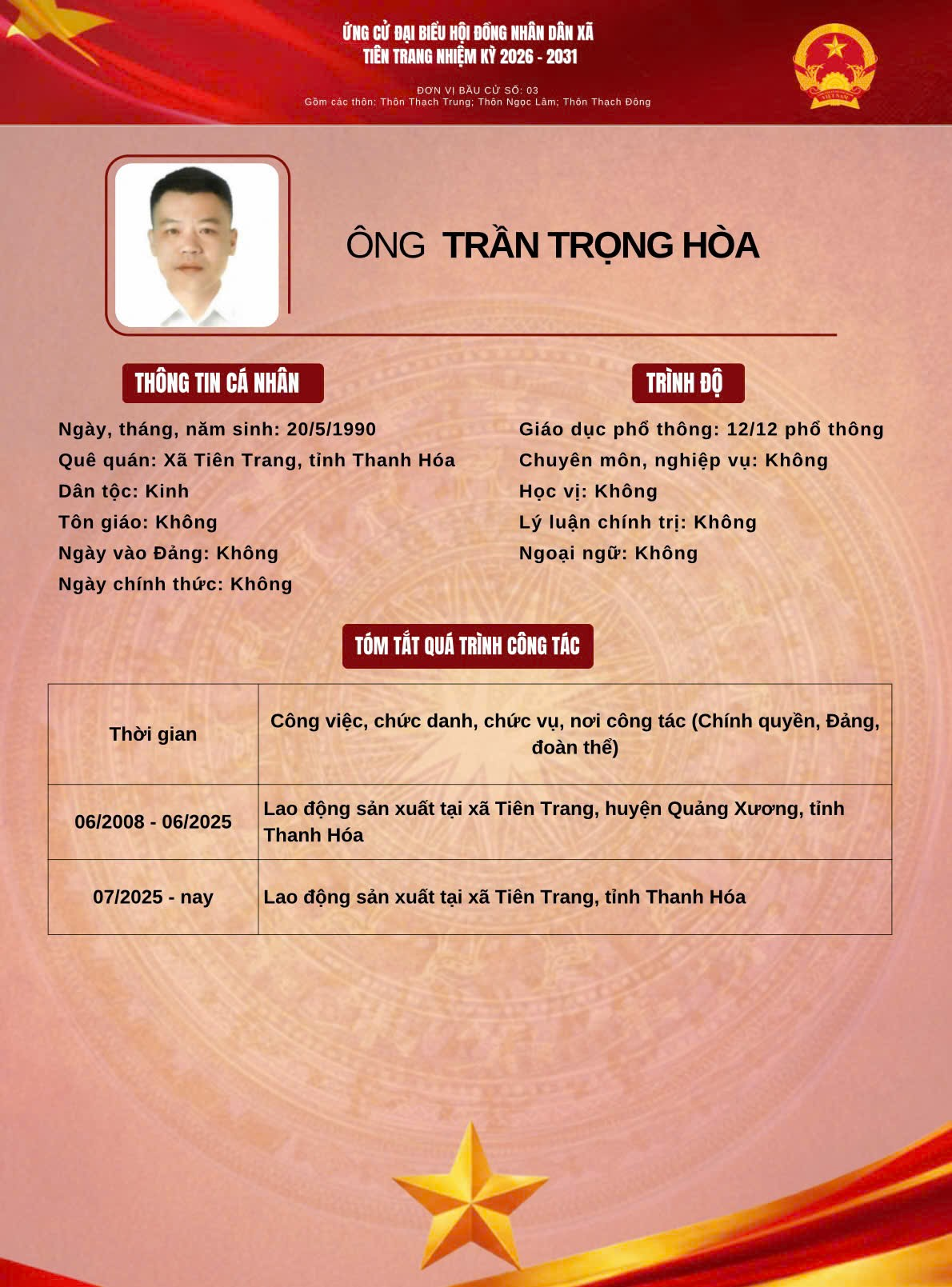 TIỂU SỬ TÓM TẮT CỦA NHỮNG NGƯỜI ỨNG CỬ ĐẠI BIỂU HĐND XÃ TIÊN TRANG KHÓA III, NHIỆM KỲ 2026-2031 - ĐƠN VỊ BẦU CỬ SỐ 03